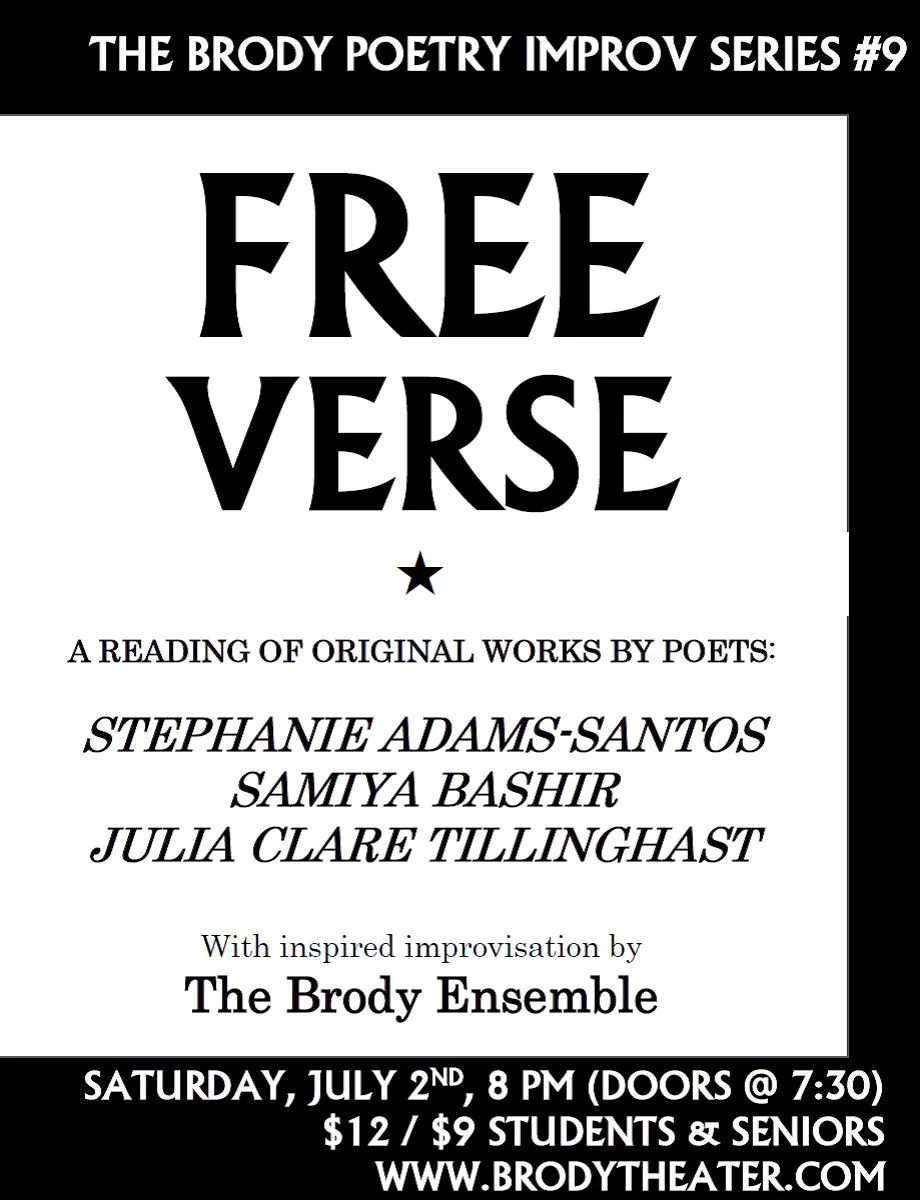 Join us at the Brody for an evening of cross-genre entertainment by The Brody Ensemble and selected guest poets. FREE VERSE is part literary reading, part spontaneous theater. Come see experienced poets and improvisers create compositions never before seen and never to be seen again.