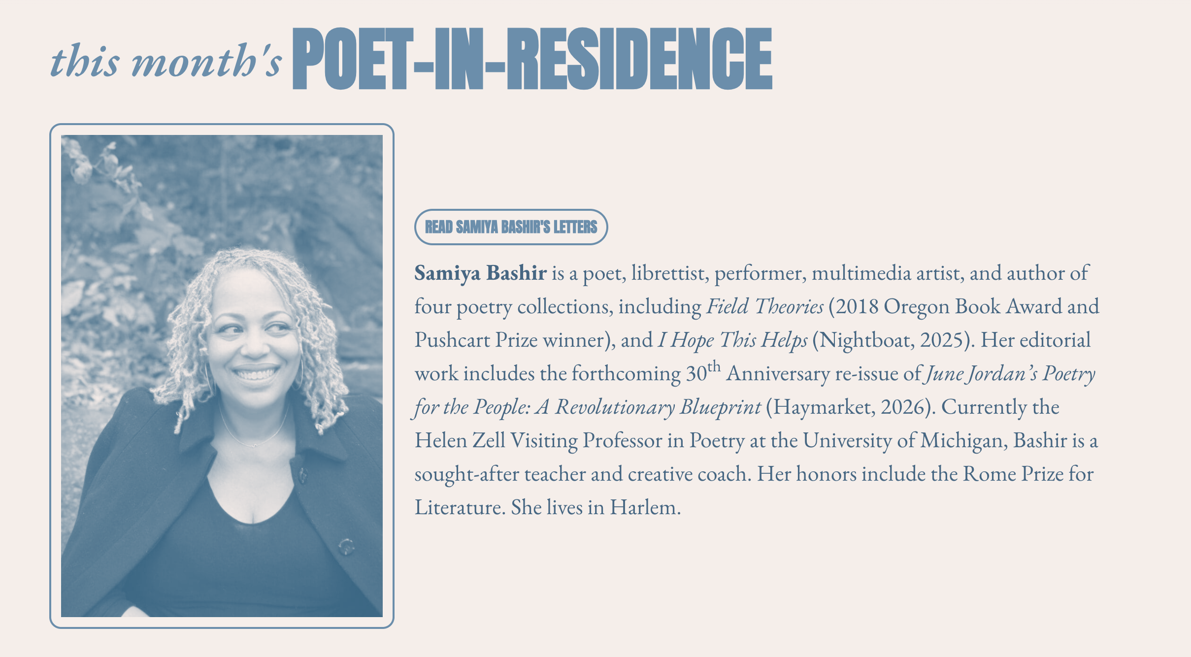 Samiya Bashir’s powerful residency with THE POETRY CLINIC found her answering a full range of questions and queries with warmth, wit, and deep poetic compassion.